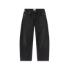 Subtle barrel silhouette, relaxed taper, high rise, zip fly