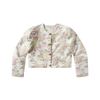 Structured, cropped, sculpted puffed shoulders, bronze-gold buttons, subtle floral print