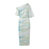 Folded neckline, sits off one shoulder, ruched through waist
