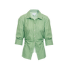 Collared, 3/4 sleeve, front angled hemline, elastic at back hem, cinched waist, self-tie at back, unlined, cotton stripe shirting, button up