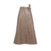 Midi skirt, high-waisted, vegan leather, self-belt, lined, tiered seam details, hidden side zipper