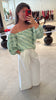 Off the shoulder perfection! This top is the perfect classic silhouette, with a fun and feminine watercolor pattern. Pair with the "Avelino Pant" to complete your look.