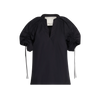 Collared V neckline, elbow-length sleeves with adjustable drawstrings, relaxed fit, hip length, slipover style