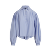 Soft pressed-pleat detail, spread collar, buttoned half-placket, long blouson sleeves