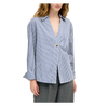 Collared, long cuffed sleeve, unlined, cut away center front hem, gold button at center front