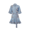 Shirtdress silhouette, point collar and stand, embroidered detail, placket with raffia buttons, in seam pockets, self-tie belt, flare skirt